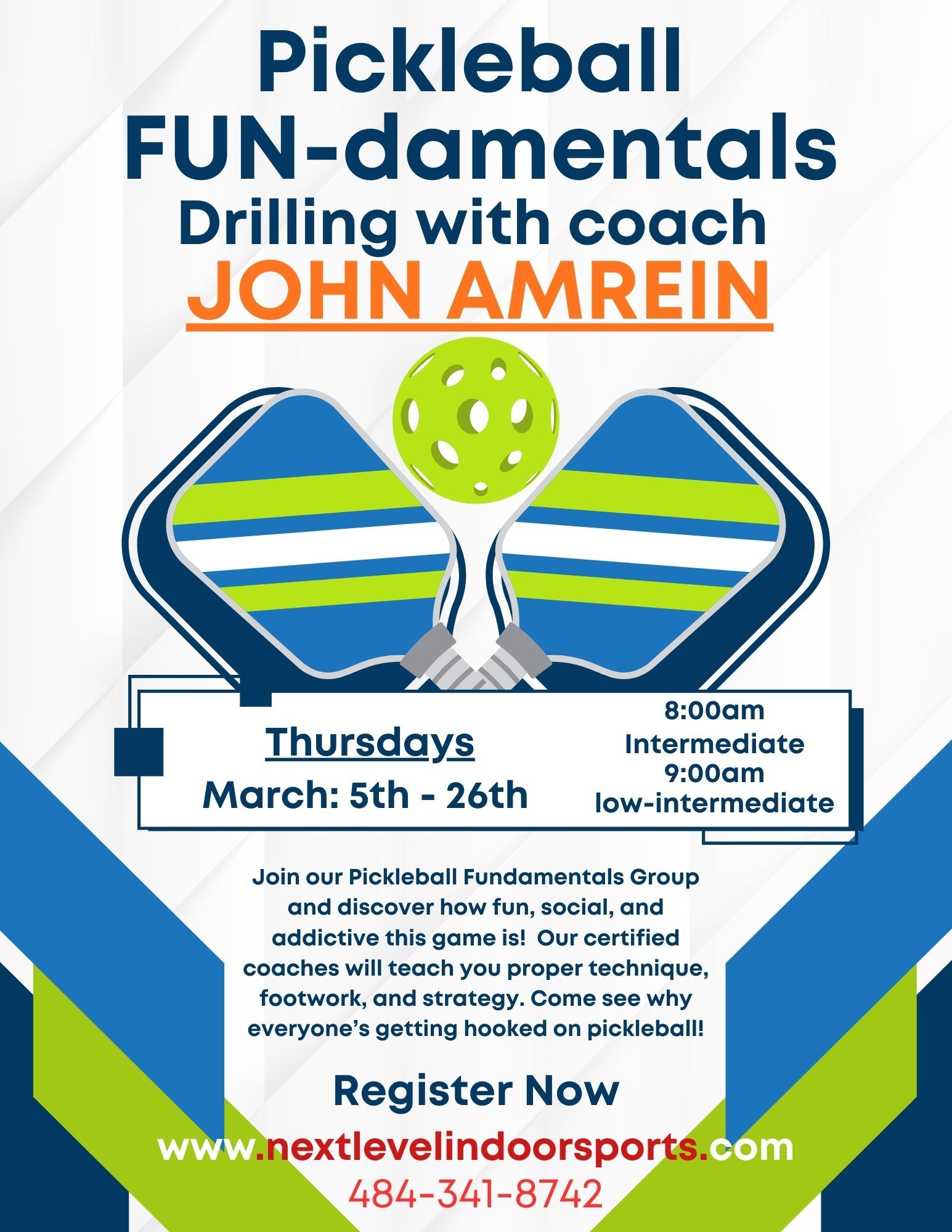 Take your pickleball game to the Next Level this fall with our 4-week Fundamental Drilling Series led by Coach John Amrein. Whether you’re just getting started or looking to refine your strategy and technique, this program is designed to help players build a solid foundation and improve all aspects of their game.