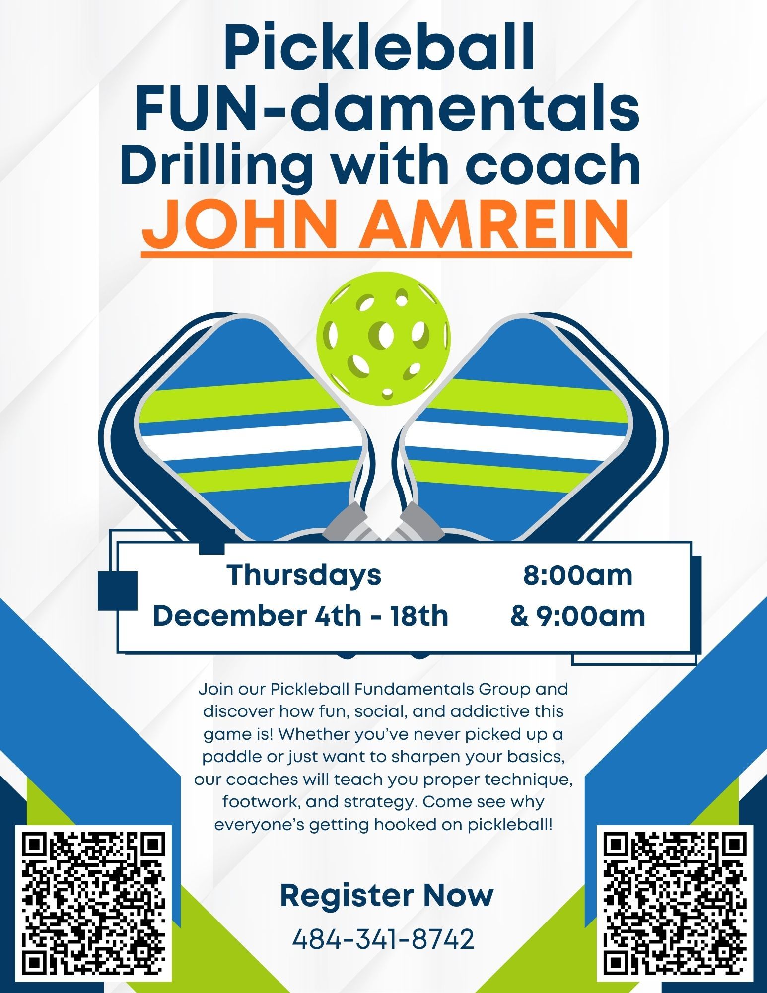 Take your pickleball game to the Next Level this winter with our Fundamental Drilling Series led by Coach John Amrein. Whether you’re just getting started or looking to refine your strategy and technique, this program is designed to help players build a solid foundation and improve all aspects of their game.